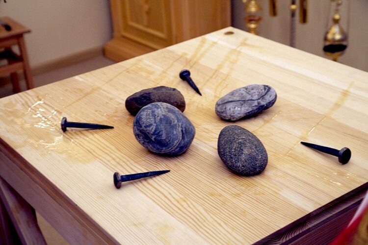 • Покладання мощей: У Престол вкладають мощі святого мученика. Це нагадує, що Церква побудована на вірі і жертві святих, які віддали життя за Христа. Мощі – це знак присутності святих у храмі.