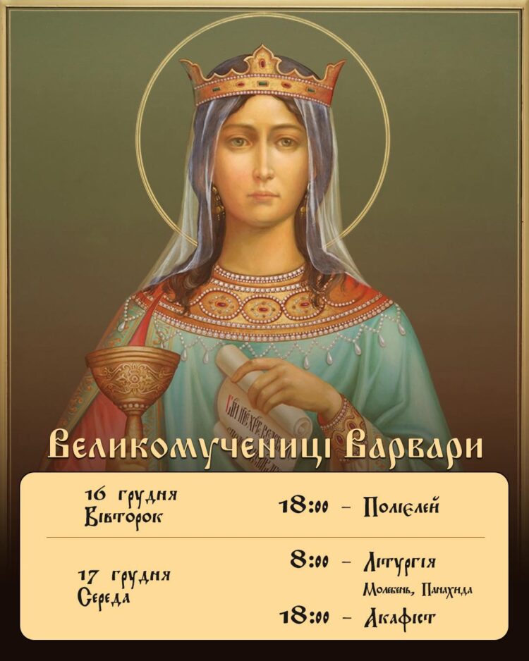 18:00 – Акафіст святій великомучениці Варварі перед її св.іконою і мощами.