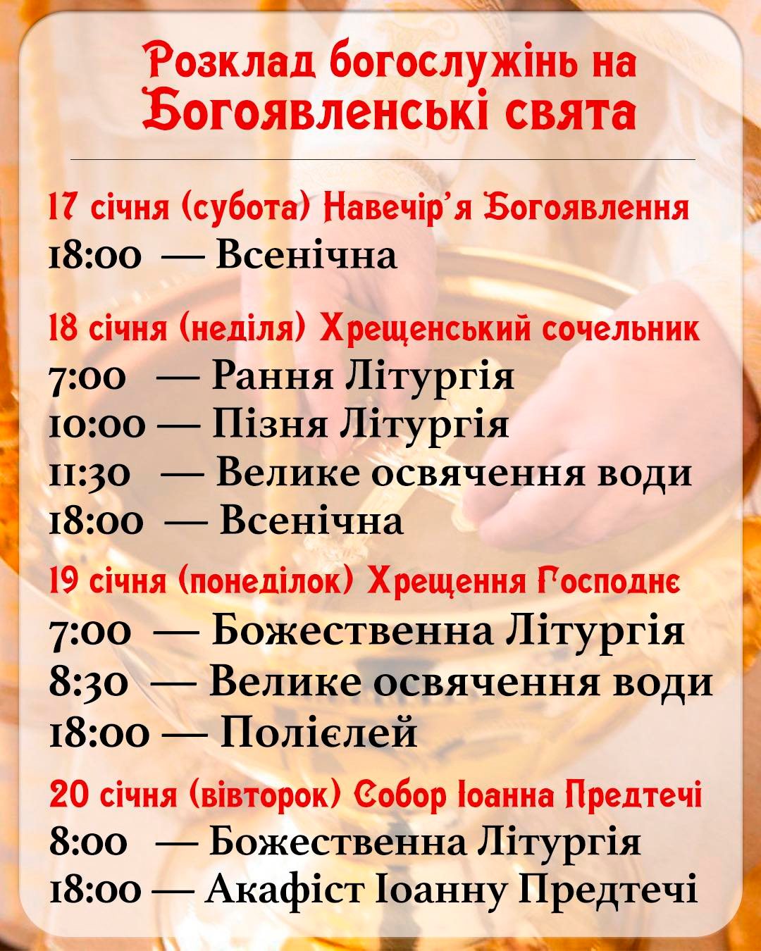 ✅ Запрошуємо познайомитися з розкладом богослужінь у святкові дні. ❗️ Зверніть увагу, що в понеділок, 19 січня, на Хрещення Господнє буде звершуватися ОДНА Літургія о 7:00 і по її завершенні - Чин Великого освячення води.<br><br><a href="https://xn--80aaxgce1a0e.com/wp-content/uploads/2026/01/616215366_908696614850789_38714788429630196_n.jpg"><img class="wp_automatic_fb_img" title="" src="https://xn--80aaxgce1a0e.com/wp-content/uploads/2026/01/616215366_908696614850789_38714788429630196_n.jpg" /></a>