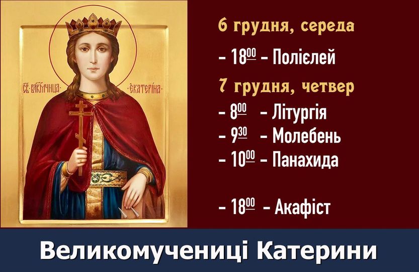 По завершенні Літургії – Молебень і Панахида. О 18:00 – Акафіст святій великомучениці Єкатерині.