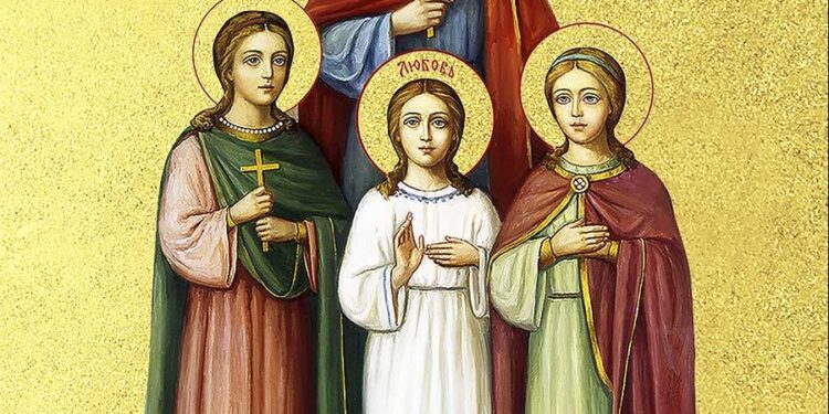 Ра́дуйтеся, три многоце́нныя сосу́ды ве́ры, наде́жды и любве́ Бо́гу в дар прине́сшия; ра́дуйся, Софи́е, я́ко, любве́ ра́ди презе́льныя ко дще́рям твои́м, всем се́рдцем возжеле́ла еси́, да Ца́рствие Бо́жие насле́дуют.