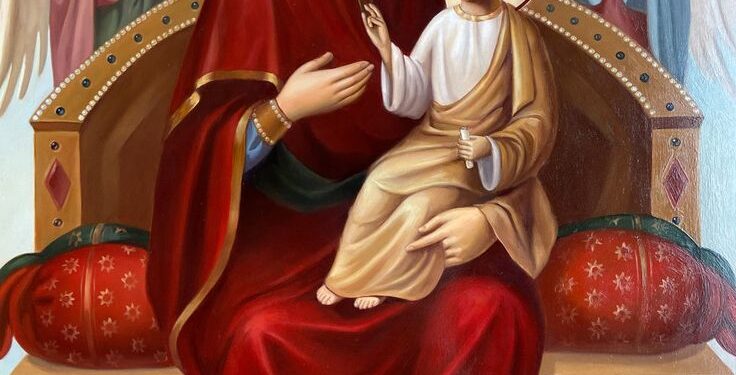 На іконі зображена Пречиста Діва в багряному вбранні, що сидить на царському троні. На руках Її – Богонемовля із сувоєм у лівій руці, що благословляє правицею. Правою рукою Богородиця вказує на Свого Царственого Сина, як на Спасителя всіх людей. На задньому плані – два ангели, які з благоговінням осіняють крилами Пречисту Діву.