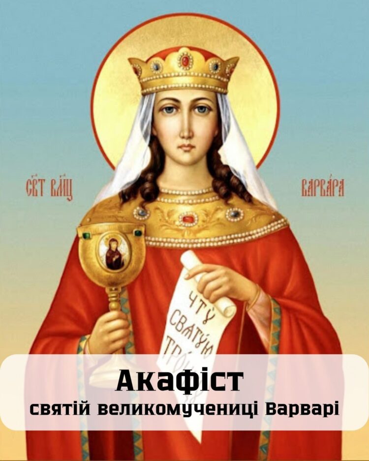 Прему́драя и всекра́сная свята́я великому́ченице Христо́ва Варва́ро! Блаже́нна еси́, я́ко преми́рная му́дрости Бо́жия пло́ть и кро́вь не яви́ тебе́, но Са́м Бо́г Оте́ц Небе́сный, И́же тебе́, ве́ры ра́ди от неве́рнаго отца́ оста́вленную, изгна́нную и умерщвле́нную, в дще́рь Себе́ возлю́бленную прия́т: за тле́нное земна́го име́ния насле́дие пло́ти нетле́ние дарова́; труды́ му́ченическия упокое́нием небе́снаго измени́ Ца́рствия; вре́менное твое́ житие́, сме́ртию Его́ ра́ди пресече́нное, сицево́ю возпросла́ви по́честию, я́ко ду́шу с ли́ки небе́сных вчини́ духо́в, те́ло же, на земли́ в хра́ме и́х а́нгельском положе́нное, а́нгелом запове́да сохрани́ти це́ло, че́стно и многочуде́сно. Блаже́нна еси́, Христу́ Сы́ну Бо́жию, Жениху́ Небе́сному уневеще́нная де́во, Его́же добро́ты твоея́ рачи́теля име́ти жела́ющи, всю́ себе́ страда́нием, ра́нами, у́дов ре́занием и са́мыя главы́ усече́нием, а́ки у́тварьми дража́йшими потща́лася еси́ украси́ти; да та́ко, я́ко жена́ ве́рна главе́ свое́й му́жу, Христу́ ду́хом и те́лом соедини́шися неразлу́чно, глаго́лющи: обрето́х, Его́же возлюби́ душа́ моя́, удержа́х Его́, и не оста́вих Его́. Блаже́нна еси́, я́ко Святы́й Ду́х на тебе́ почи́л е́сть, и́мже духо́вными духо́вная разсужда́ти науче́на, вся́ ду́хи лука́вствия во и́долах, я́ко па́губныя отри́нула еси́, и еди́наго Бо́га Ду́ха позна́вши, я́ко и́стинная покло́нница, ду́хом и и́стиною кла́нятися изво́лила еси́, пропове́днически глаго́лющи: Тро́ицу чту́, еди́но Божество́. Сию́ Святу́ю Тро́ицу, Ю́же в животе́ и сме́рти испове́данием и страда́нием свои́м просла́вила еси́, умоли́ о мне́, предста́тельнице моя́, я́ко да и а́з всегда́ тро́йственною, ве́ры, любве́ и наде́жды, ту́южде Святу́ю Тро́ицу почита́ю доброде́телию. И́мам свети́льник ве́ры, но пра́зден благи́х де́л еле́я, ты́, му́драя де́во, страда́льческую пло́ть твою́, кро́ве испо́лненну и ра́нами прелива́ющуся, а́ки свети́льник иму́щая, да́ждь от еле́я твоего́, да те́м душе́вную мою́ свещу́ украси́вши, сподо́блюся по тебе́ вни́ти в черто́г небе́сный. Пресе́льник а́з е́смь на земли́ и пришле́ц, я́коже вси́ отцы́ мои́; бла́г ве́чных насле́днице и, блаже́нная, обе́да в Ца́рствии небе́сном прича́стнице, я́ко в стра́нствии жития́, трапе́зы боже́ственныя угоще́ния, си́це и во исхо́де от ми́ра, жела́емаго сподо́би мя́ напу́тствования; и егда́ в коне́ц сно́м сме́рти начну́ усыпа́ти, косни́ся тогда́ изнемога́ющия пло́ти моея́, я́ко иногда́ а́нгел Илии́, глаго́лющи: воста́ни, я́ждь и пи́й, я́ко да благода́тию боже́ственных Те́ла и Кро́ве Та́ин укрепле́н, преиду́ в кре́пости я́ди тоя́ дале́кий пу́ть сме́рти, да́же до горы́ небе́сныя; и та́мо, Его́же ты́ чрез три́ о́кна ба́нныя пре́жде ве́рою Бо́га Тро́ицу узре́ла еси́, Сего́ ку́пно с тобо́ю лице́м к лицу́ да удосто́юся ви́дети, и сла́вити Его́ в несконча́емыя ве́ки, ами́нь.