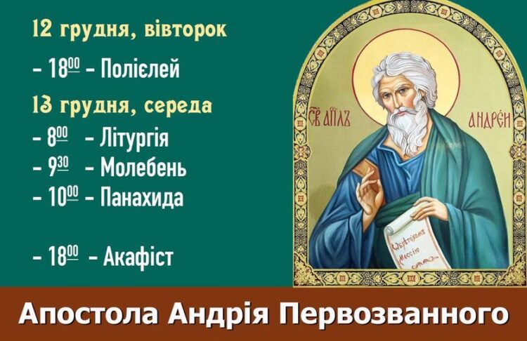 Святе причастя о 8:00, 13 грудня. По завершенні богослужіння – вітання іменинників та Молебень і Панахида.У вечері, 13 грудня, о 18:00 – акафіст святому Апостолу