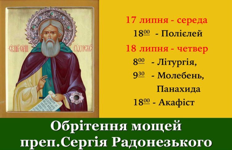 ігумена Радонезького, покровителя нашої громади вшановує Церква Христова. Запрошуємо на спільну молитву. 17 липня - середа 18:00 - Полієлей 18 липня - четвер 8:00 - Літургія 9:30 - Молебень, Панахида 18:00 - Акафіст на розпів