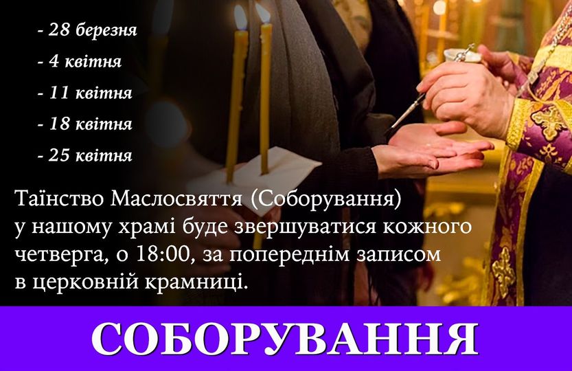 Для участі в таїнстві Маслосвяття (Соборування) необхідно завчасно записатися у церковній крамниці (працює щодня з 8:00 до 18:00) на зручний для Вас четвер протягом Великого Посту.
