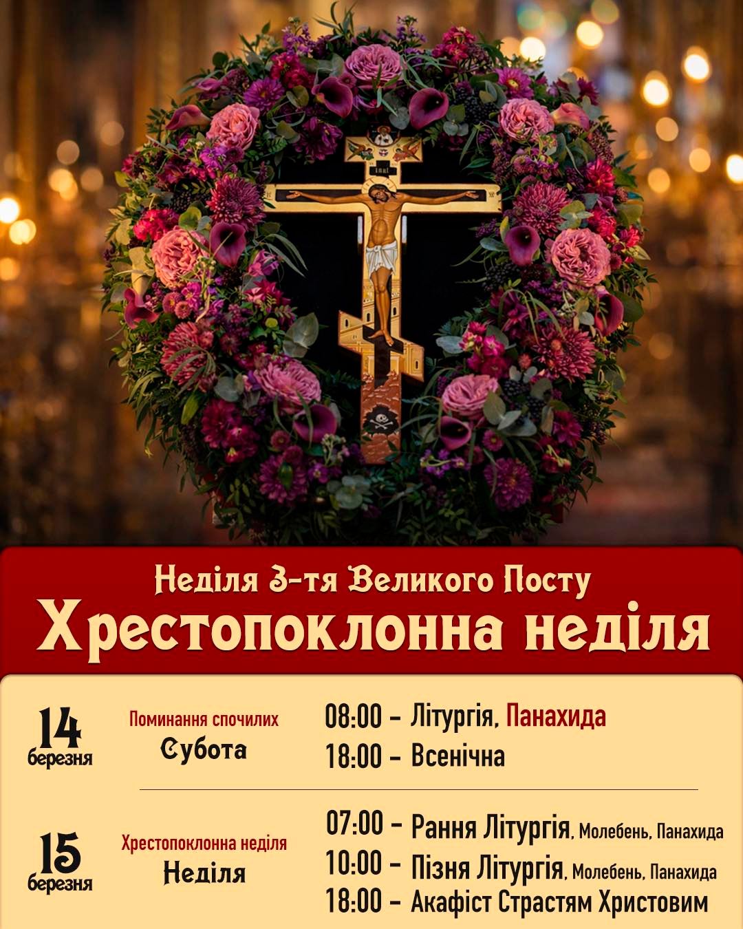 Наступає Хрестопоклонна неділя — особливий день у середині Великого посту. Церква ставить перед людиною Хрест Христовий, щоб укріпити її сили.