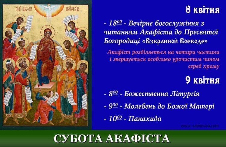 Вона наша Воєвода - зрощена Богом Заступниця і Покровителька, Котра позбавляє нас від усяких бід. Принесемо сумлінну молитву Божій Матері про припинення війни і настання миру, про поразку ворога і посрамлення усіх, хто востає на український народ.