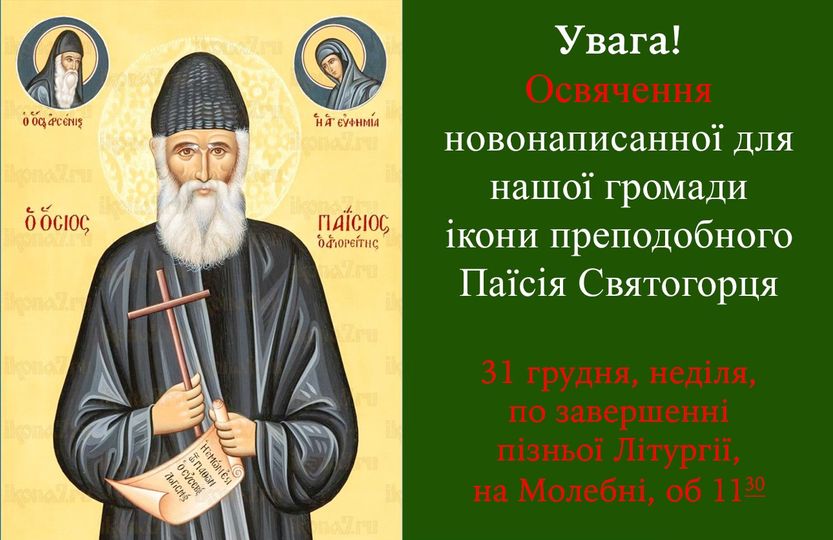 З ініціативи та коштом родини парафіян нашого храму, було написано ікону преподобного Паїсія Святогорця. Освячення новонаписанної ікони відбудеться в неділю, 31 грудня, по завершенні пізньої Літургії, на Молебні, об 11:30.