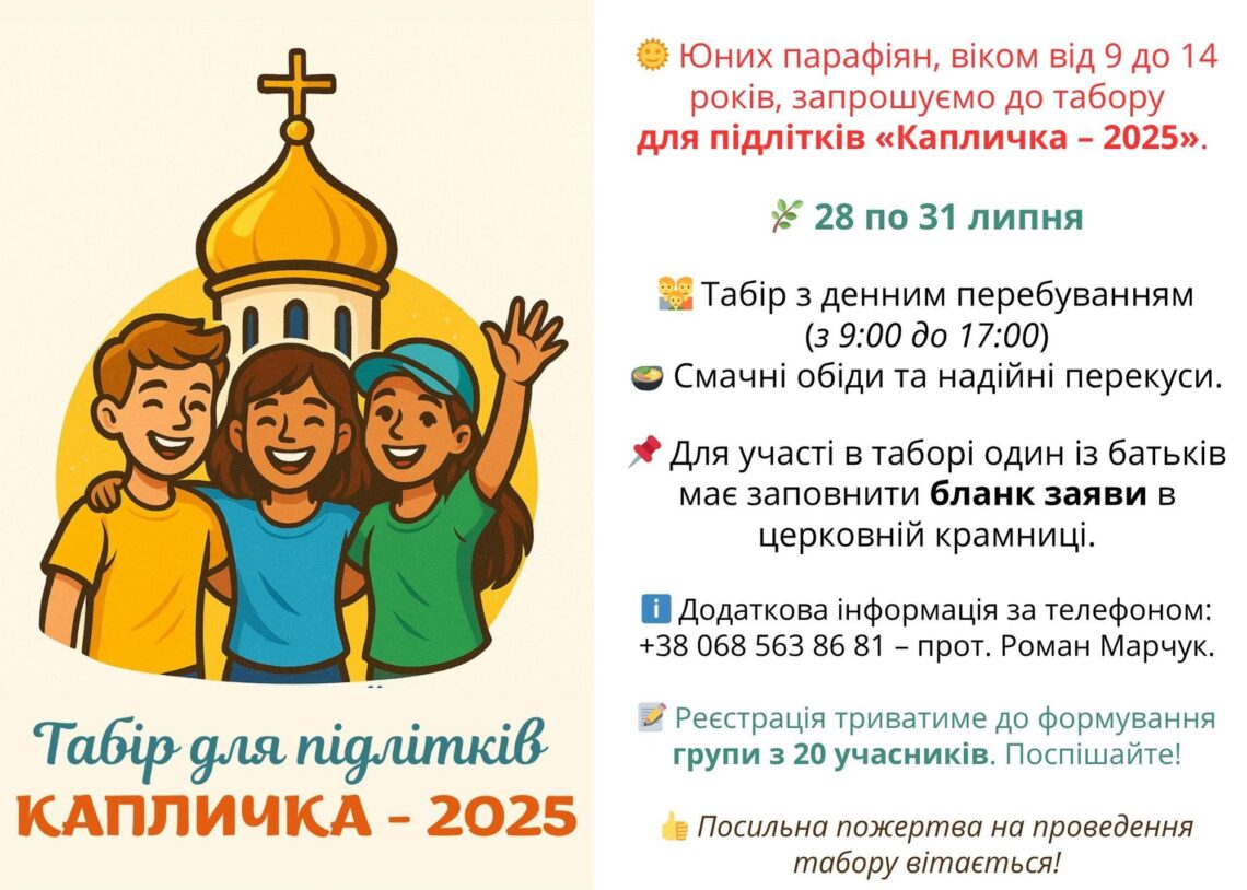 Запрошуємо юних парафіян та їхніх друзів віком від 9 до 14 років провести незабутні літні дні в дружньому колі однолітків!