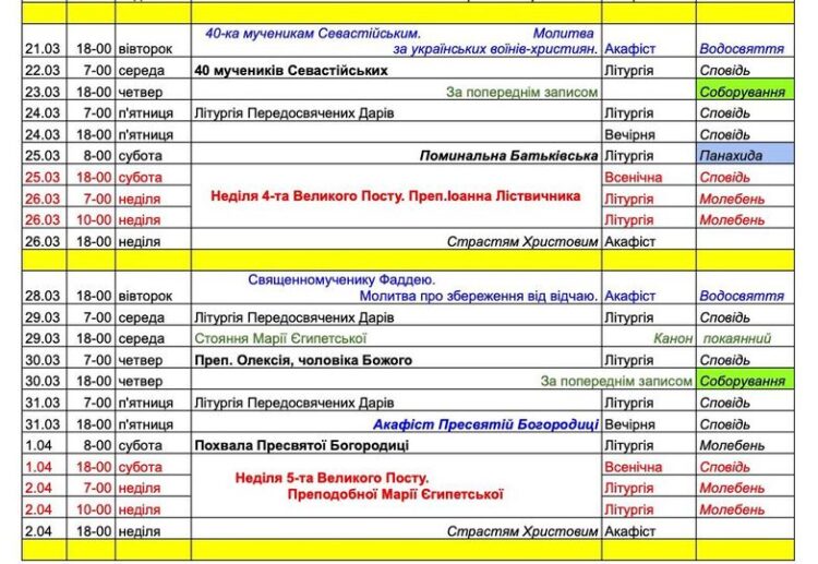 Розклад богослужінь на 21 березня – 2 квітня 2023: