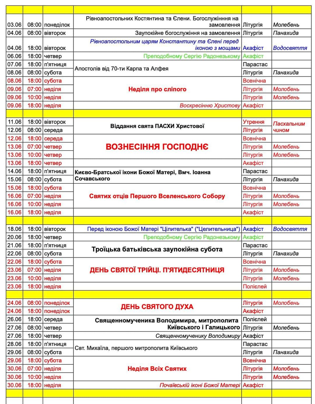 Розклад богослужінь на червень.