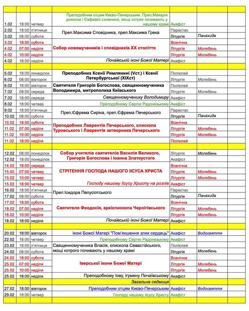 Розклад богослужінь на лютий