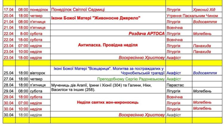 Розклад богослужінь на Пасхальний період квітня