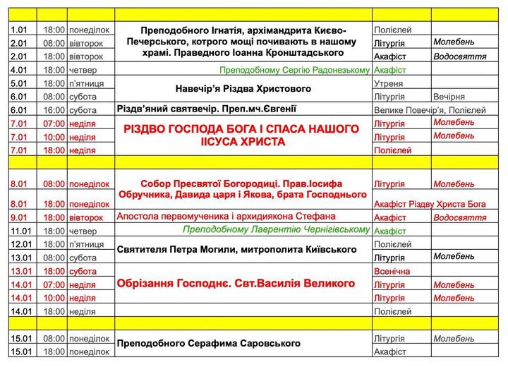 Розклад богослужінь на першу половину січня 2024 року