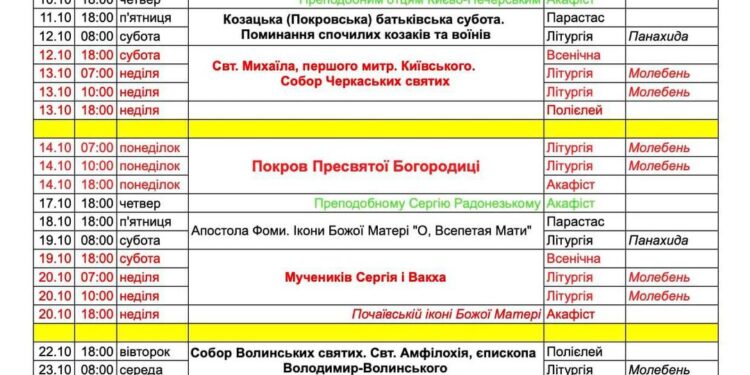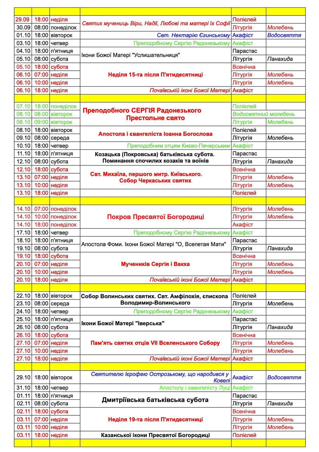 Розклад богослужінь на жовтень.