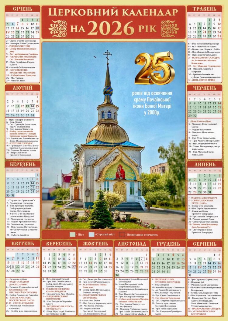 «Церковний календар» на 2026 рік видано нашою громадою з нагоди 25-ї річниці освячення храму Почаївської ікони Божої Матері.