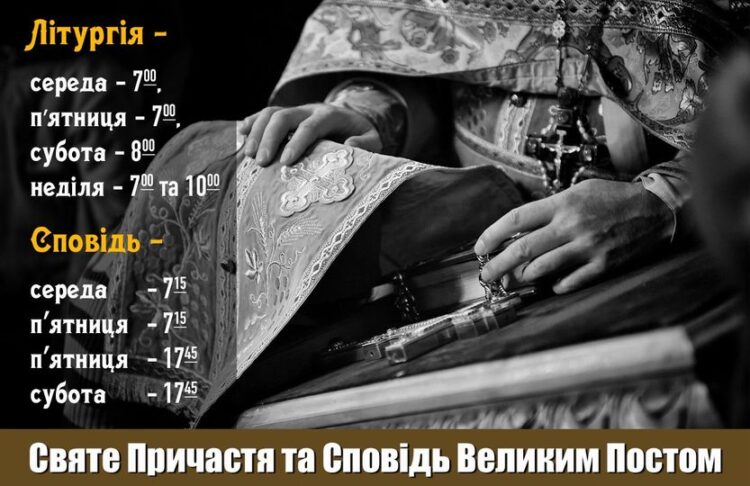 Впродовж Великого Посту приступити до таїнства Покаяння можна кожної середи та пʼятниці на початку ранкового богослужіння. Молитви до Сповіді звершуються священником о 7:15.