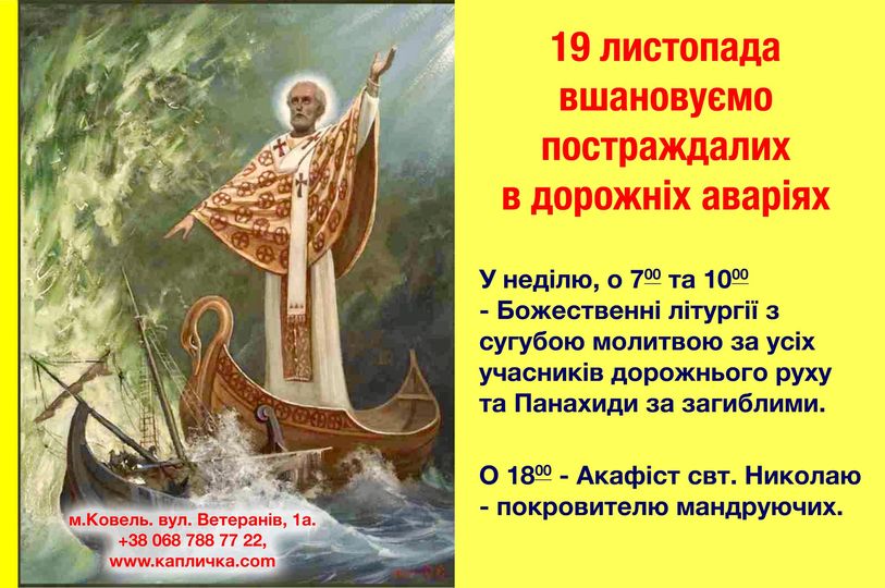 19 листопада вшановуємо постраждалих в дорожніх аваріях У неділю, 19.10, о 7:00 та 10:00- Божественні літургії з сугубою молитвою за усіх учасників дорожнього руху та Панахиди за загиблими. О 18:00 - Акафіст свт. Николаю - покровителю мандруючих, перед його святою іконою з мощами.