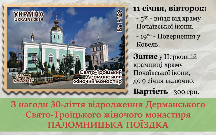 На запрошення ігумені і сестер Дерманського Свято-Троїцького жіночого монастиря, 11 січня відбудеться паломницька поїздка з нагоди 30-ліття відродження обителі.