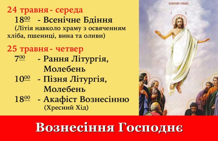 – 18:00 – Акафіст Вознесінню (Хресний Хід)